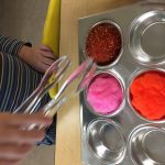 In the month of November, the children in both classes continued to explore web making with materials such as sticks and pipe-cleaners. As they explored, they asked questions such as how can I make it stay on a stick? How can I use it to make a web? A spider? What shape can I make if I bend it here? When we extended the experience by adding pine cones and wool. Many children noticed the softness of the wool as they compared it to the strings of hemp and silver thread. With the addition of materials, the children’s skills also evolved. Some children are now able to connect the pine cones to the sticks and are fascinated at how it dangles, some even considered it to be ‘spooky’!